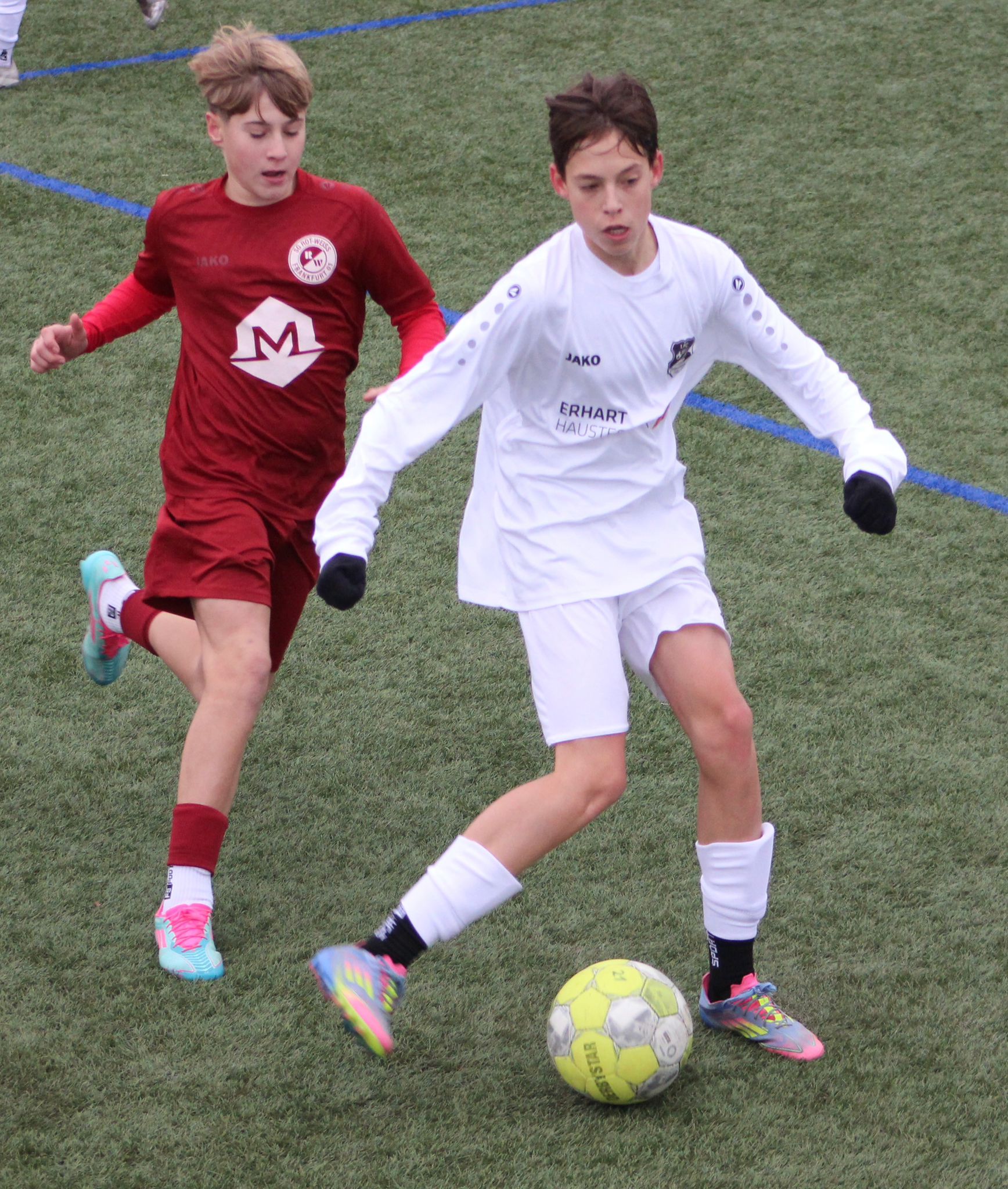 Nachdem der 1. FC 1906 Erlensee die erste Hälfte weitestgehend im Griff hatte, begann die zweite Halbzeit etwas ausgeglichener. In der 41. Minute hatte Rot-Weiß Frankfurt eine gute Kopfball Chance. Zwei Minuten später dann Erlensee mit der Chance zur Entscheidung. Nasir schließt stark ab, sein Schuss geht aber knapp über die Latte. In der 54. Minute ist dann Tom nach einem Konter mit viel Tempo auf dem Weg zum Tor, wird aber vom gegnerischen Verteidiger rüde mit einer Grätsche von hinten gelegt. In der 70. Minute dann doch noch das unnötige 2:3 für Frankfurt nach einem Einwurf. Danach folgten noch zwei aussichtsreiche Konter der jungen Raben, welche jedoch leichtfertig vergeben wurden.